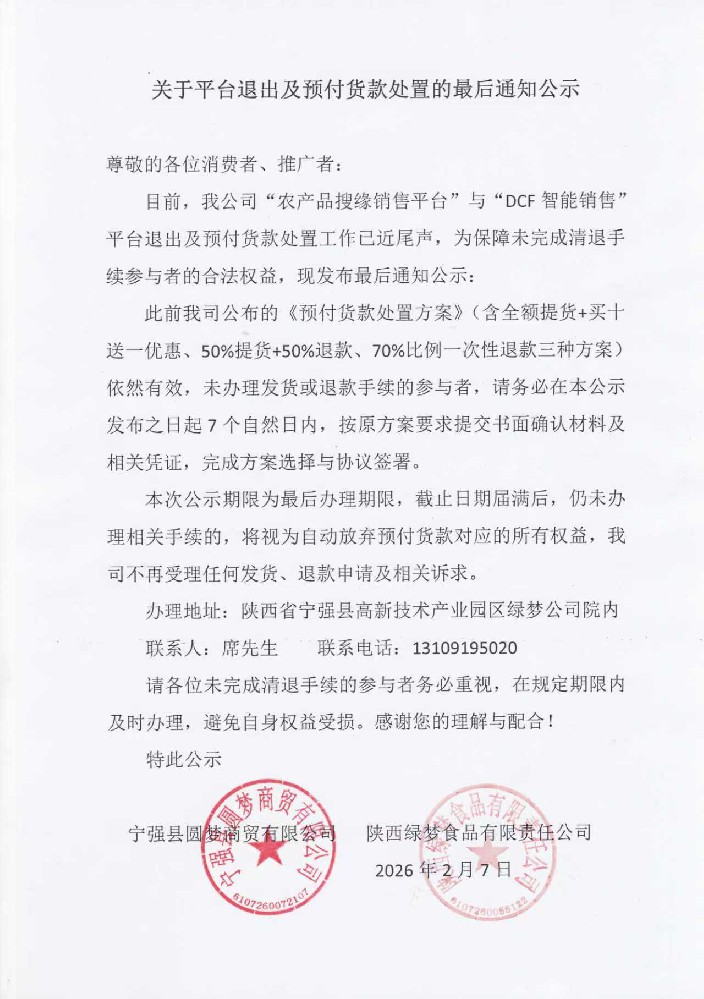 宁强县圆梦商贸有限公司 关于平台退出及预付货款处置的公示