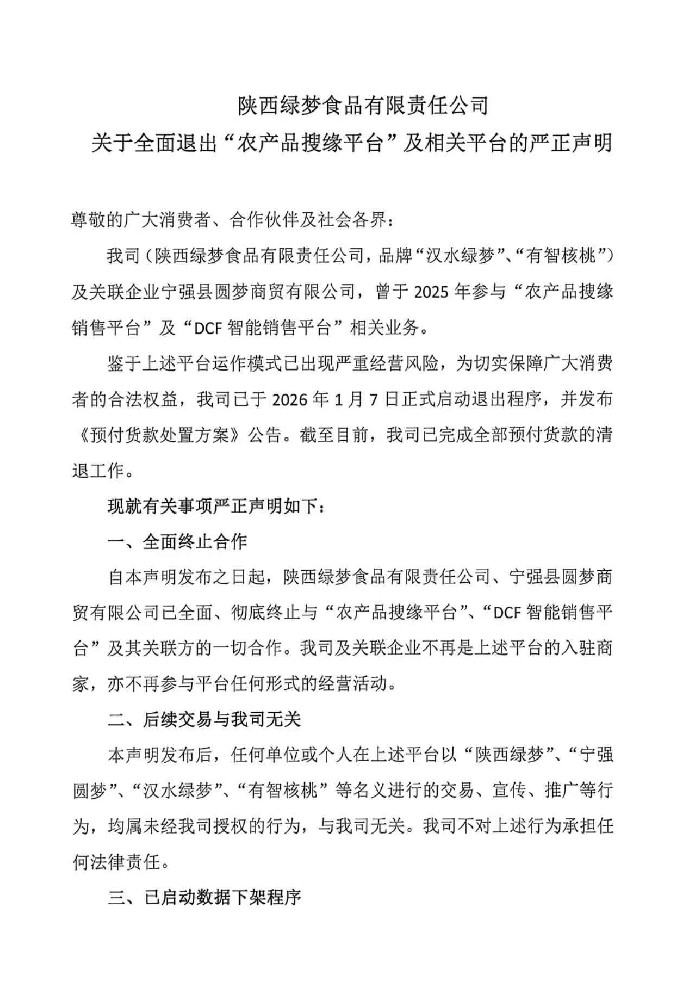 陕西绿梦食品有限责任公司关于全面退出“农产品搜缘平台”及相关平台的严正声明