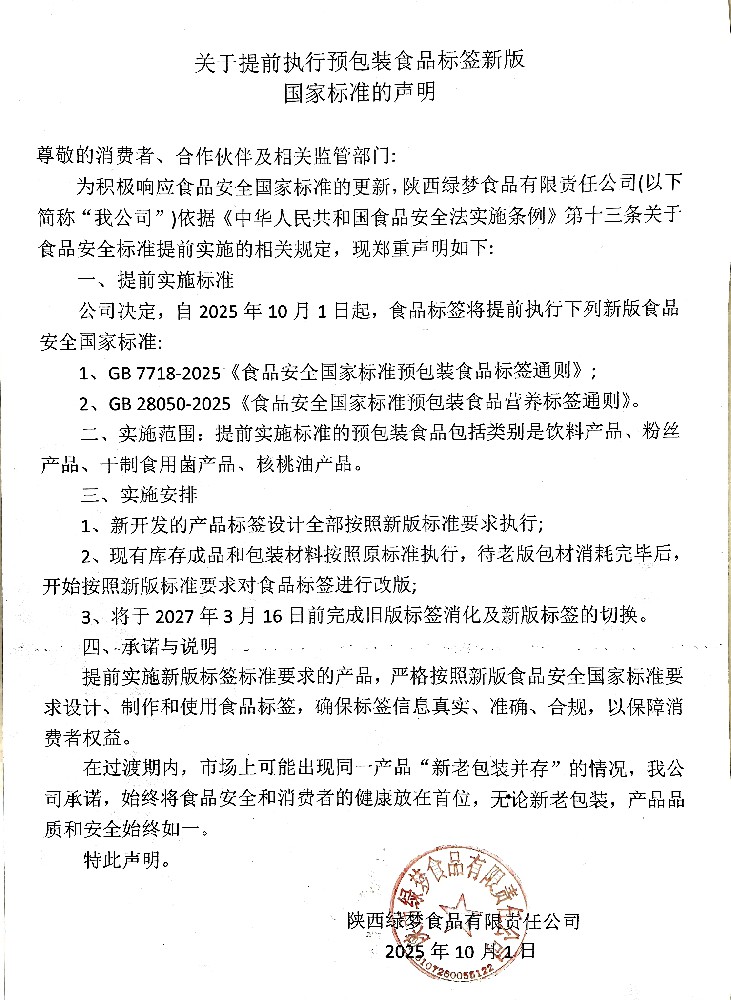 关于提前执行预包装食品标签新版国家标准的声明